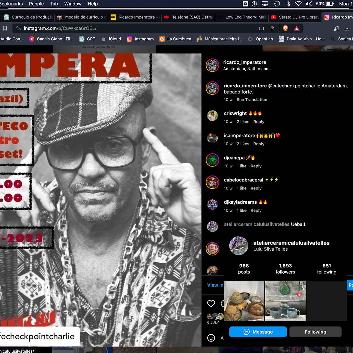 Producer, percussionist, photographer, performer Dj Ricardo Imperatore is part of that restricted authorial musicians who perform a unique repertoire with remixes and a balance of the perfect fusion between Brazilian and world music with global beats. Since 1995 Imperatore has collaborated with artists such as Mario Caldato, Natalie Cole, Susanne Vega, Man At Work, Midnight Oil, Marisa Monte, Titãs, Tom Capone, Monobloco among others. Since 2000, Imperatore has developed the BOTECOELETRO project. Influenced by the dif- ferent aspects of Brazilian and world music, from pop to root folk, passing through the erudite, and earned BOTECOELETRO the Best Electronic Album Award of 2005 at the Brazilian Music Award. 2012; Imperatore es BOTECOELETRO Vol. 2, also nominated for best electronic album in the 2013 edition of the Brazilian Music Awards. Imperatore has performed Europe, USA, Latin America and Asia: Reunion Islands, New York, London, Paris, Berlin, Istanbul, Tokyo, Hamburg, Bar- celona, Vienna, Turin, Bologna, Amsterdam, Lisbon, Porto, Split, Copenhagen, Antwerp, Liechtenstein, Mexico City, La Paz, São Paulo and Rio de Janeiro and Brazil- ian major cities.